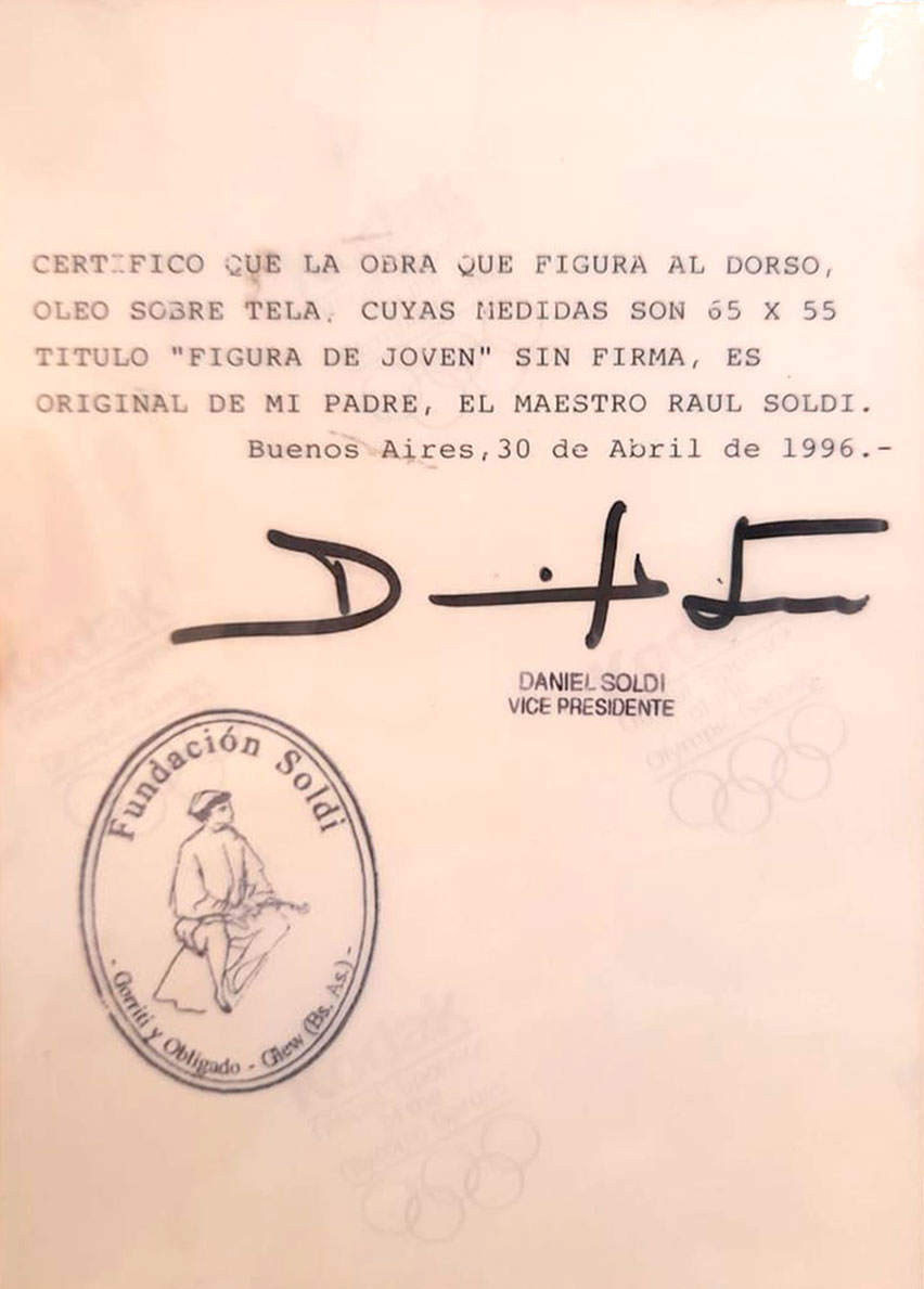 Óleo sobre tela. Mide: 65 x 55 cm. Ref.: Foto certificado de autenticidad extendido por el Sr. Daniel Soldi, hijo del artista y vicepresidente de la Fundación Soldi, con fecha 30 de abril de 1996.
