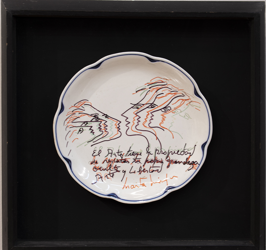 Plato en cerámica. Firmado Marta Minujin, abajo al centro. Diámetro: 26 cm. Ref.: Leyenda "El arte tiene la propiedad de rescatar tu propia grandeza oculta . Arte y libertad. Marta Minujin", abajo al centro.